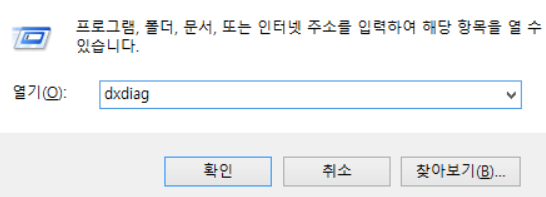 여기 창에 사진에서 보는거와 같이 'dxdiag'를 치고 확인을 누릅니다.