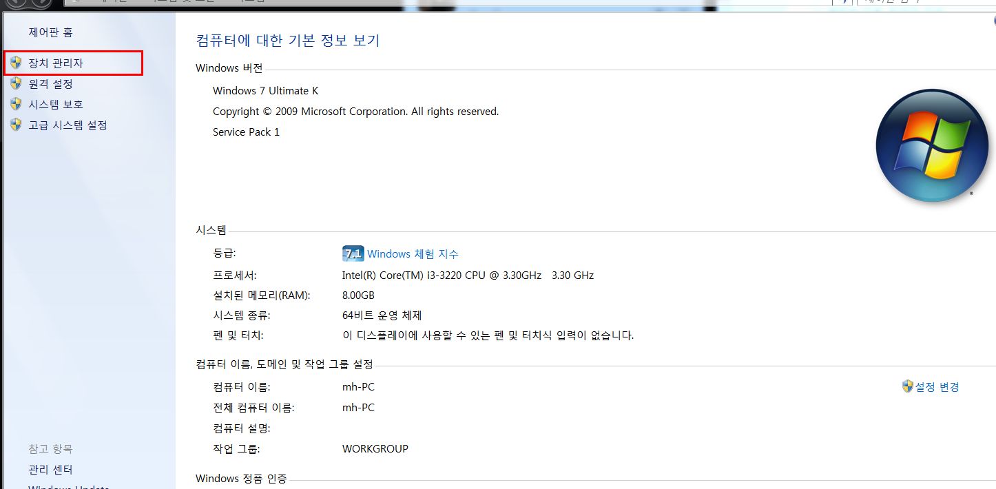 빨간네모칸의 장치관리자를 눌러주게 되면